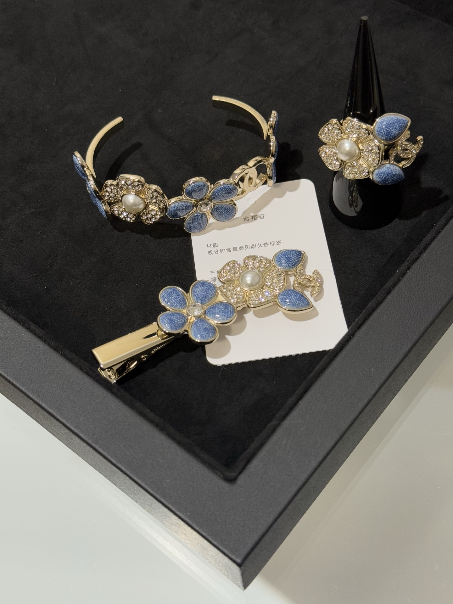 Chanel 26C Blue Denim Flower Diamond Paved Cuff Bangle Bracelet