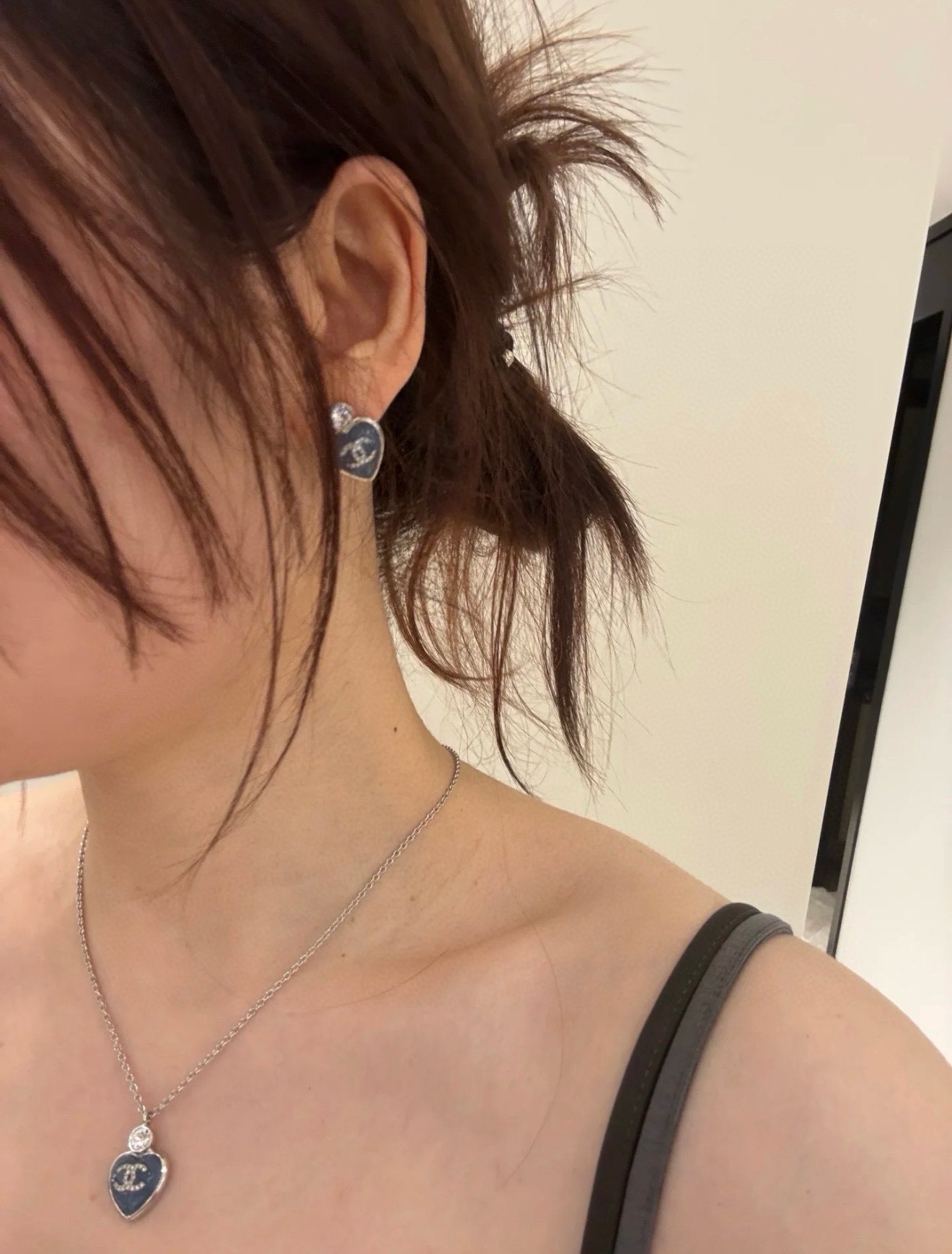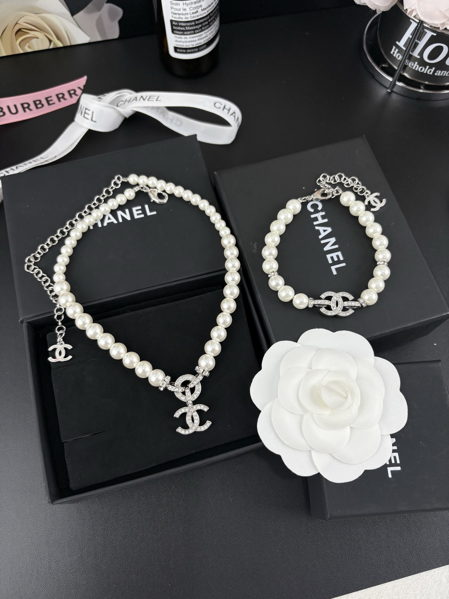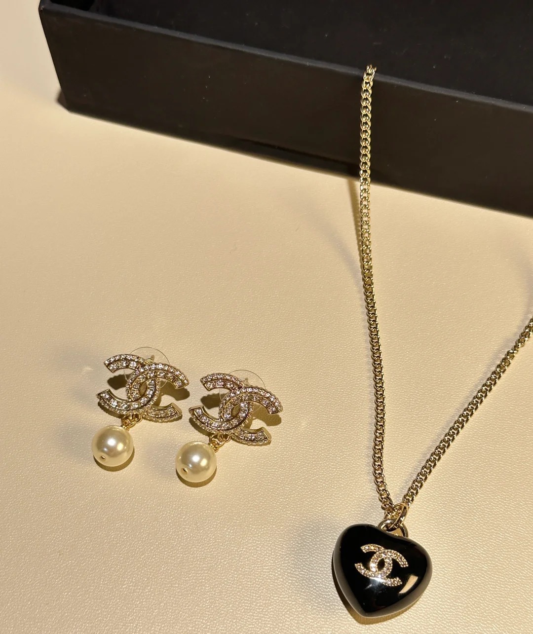 Chanel Black Heart Pendant Necklace and CC Pearl Drop Earrings