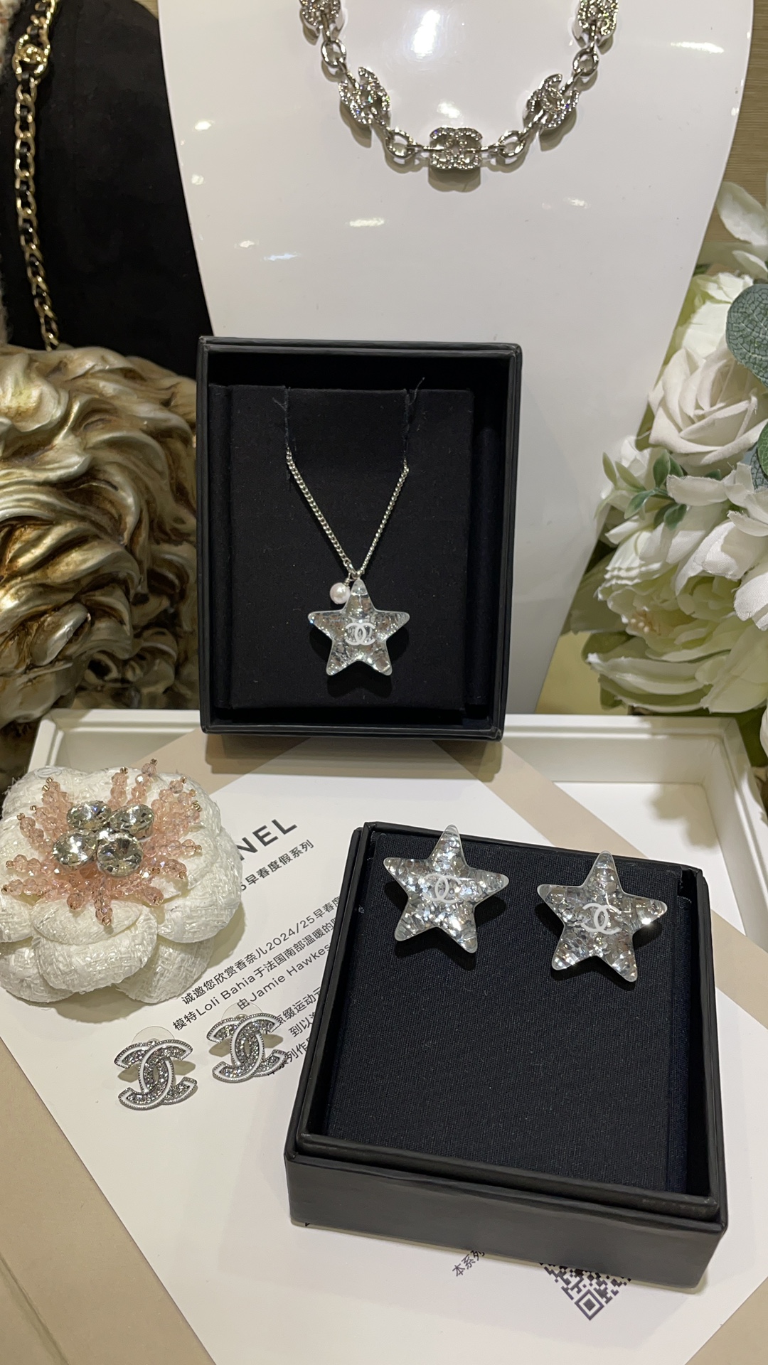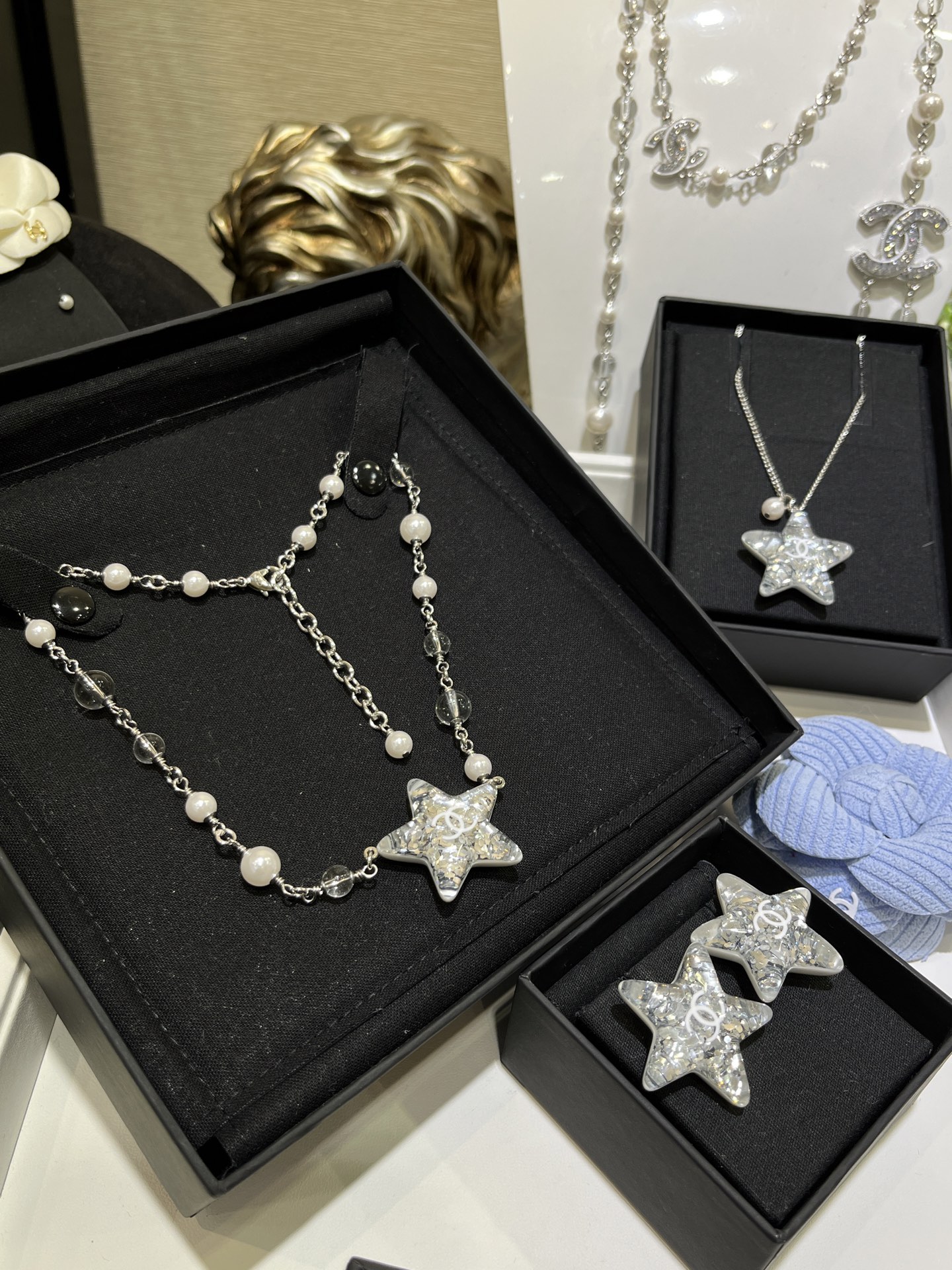 Chanel Silver Shiny Star Necklace and Earrings