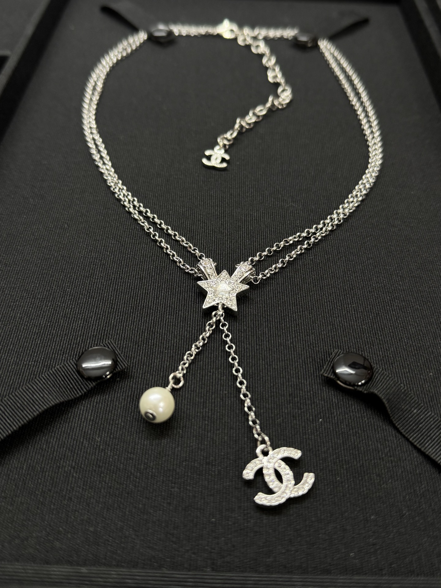 Chanel Black White Pearls Shiny Star Pendant Necklace